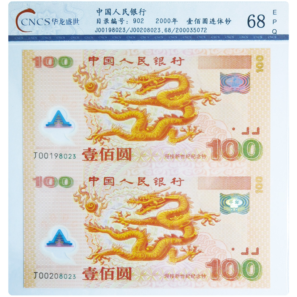 正面圖案:正面圖案主景是以坐落在北京北海公園北岸的九龍壁中第三條龍(亦稱升龍)為設(shè)計依據(jù)。只見矯健雄姿,威嚴無比的大升龍從大海中騰空而起,張開百川大口,直視左側(cè)熊熊燃燒的“火球”,象是和“火球”跳著吉祥舞蹈,迎接新千年的到來,迎接我國首套塑料紀念鈔的橫空出世。